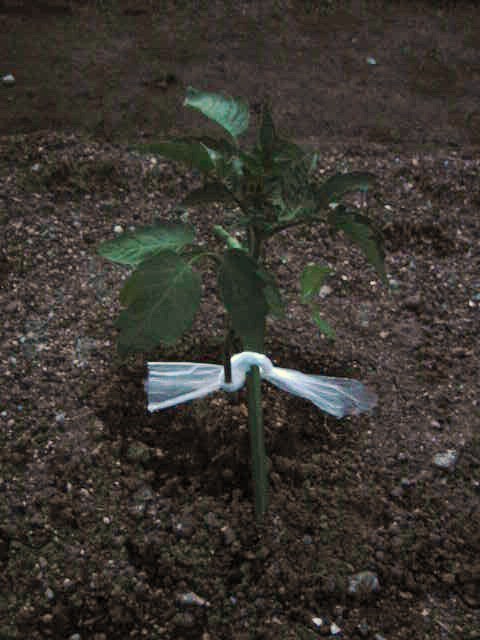 風で苗が倒れないように添(そ)え木をしています。